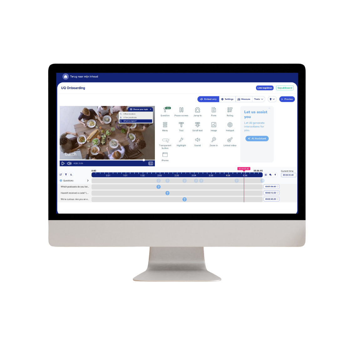 Maak video’s interactief met vragen, keuzes, links en calls-to-actions. Zo wordt je content niet “kijken”, maar doen — ideaal voor onboarding, ondersteuning en activatie.